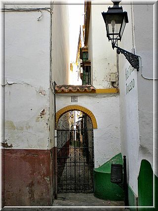 Bario Santa Cruz to glownie platanina waskich uliczek w ktorych znajduja sie hoteliki, sklepy z pamiatkami i niezliczone bary tapas. W tych mniej „pod turystow” siedza autochtoni kopcac papierosy i strzepujac niedopalki na podloge. No ale tam podobno jedzenie najlepsze 😉 Na Plaza Virgen de Los Rejes parkuja konne dorozki czekajace na pasazerow – uroczy dzwiek konskich kopyt miesza sie niestety ze smrodkiem lezacych wkolo kup… ale kto by tam sie tym przejmowal. Wszedzie mozna sie natknac na napis NO8DO ktorego legende bardzo ladnie opisano tu: http://baginski.eu/2007/05/29/no-8-do/, oraz na wszechobecne napisy, szyldy i reklamy na murach wykonane z azujelos, pokrytych szkliwem ceramicznych plytek.