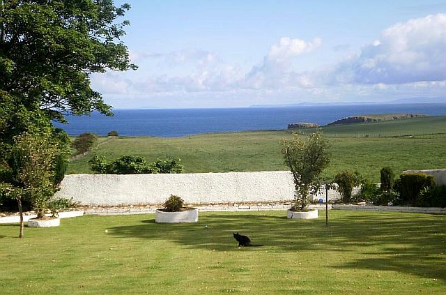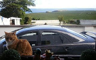 Sniadanie boskie. Jogurty, owoce, przerozne muesli, tosty, chleb, cokolwiek bysmy nie chcialy. A kiedy weszlysmy paniom wlascicielkom do kuchni zeby zaplacic, ujrzalysmy sliczny widok z okna – zielony, przystrzyzony trawnik a z nim morze. No taki krajobraz miec jak sie zmywa gary to rozumiem! I na dodatek na parapet wskoczyl rudy kot!