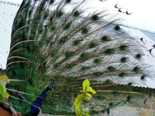 Ten piekny pan chodzil sobie po ogrodach i ogon wlokl za soba, dopiero kiedy na dachu budynku pojawila sie samiczka okazal inicjatywe i ruszyl w jej kierunku. I kiedy zaczelysmy robic jej zdjecia, on jakby ja chcac chronic rozpostarl ogon i zakryl ja calkowicie.