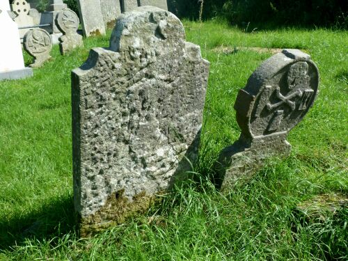 Nagrobki sa istotnie nietypowe i takich tu jeszcze w Irlandii nie spotkalam, z wygrawerowana czaszka i skrzyzowanymi koscmi, trumna, czasem dzwonkiem i klepsydra.