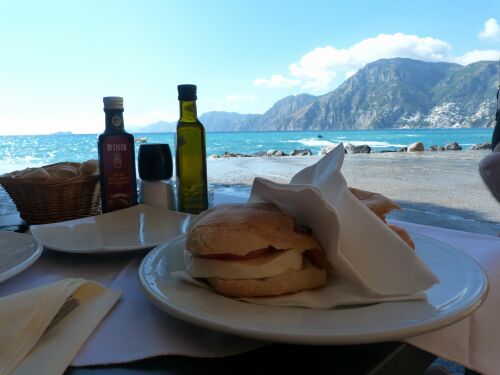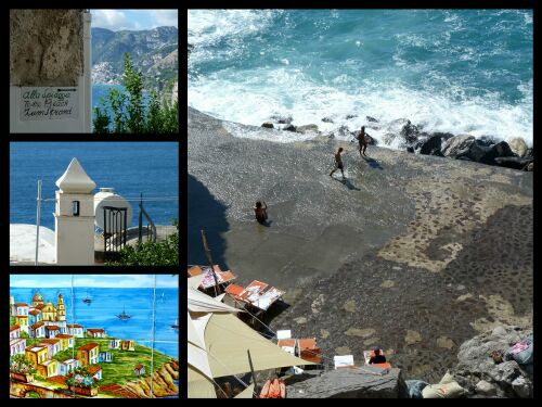 Fantastyczne jest Praiano ktore chyba byloby rowniez ciekawa baza do zwiedzania wybrzeza, a jednoczenie spokojnym miejscem do relaksu majacym klimat dawnych lat, nie za bardzo turystyczne. Jest tam z 7 kosciolow i pare plaz (czesc z nich dostepna tylko z morza) no i przede wszystkim One Fire Beach dla tych ktorzy lubia ryzyko bycia dokladnie zalanym woda calkowicie i znienacka. To nawet nie jest plaza, raczej betonowe patio otoczone skalkami i dobrze ukryte. Co jakies piec minut chlupie na niego wysoka fala ku uciesze gawiedzi, co mozecie zobaczyc np na tym moim krotkim filmiku. Za lezak placi sie 20 e, my nie lezakowalysmy a tylko siedzialysmy w barze ktory ma troche ciut za wysokie ceny za jedzenie i za glosna muzyke, co jednak nie zmienia faktu ze miejsce jest rewelacyjne. Widac stamtad pieknie Positano.