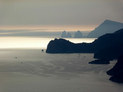 Amalfi town to przede wszystkim Duomo wylaniajace sie znienacka olsniewajac niczego nie spodziewjacego sie turyste swa wielkoscia, schodami i majestatem. Wybudowano go w XI wieku w stylu bizantyjskim, po drodze cos tam dorabiano i przerabiano wiec teraz mozna sie doszukac wplywow architektonicznych ze wszystkich prawie stuleci. Jakkolwiek nie przepadam za budowlami sakralnymi jako takimi to musze przyznac ze katedra robi wrazenie i na zewnatrz i wewnatrz. Samo miasteczko tez jest ladne, wcisniete miedzy strome skaly ktorych czubki tona we mgle, a morze. Troche za duzo turystow na glownej ulicy ale coz poczac.