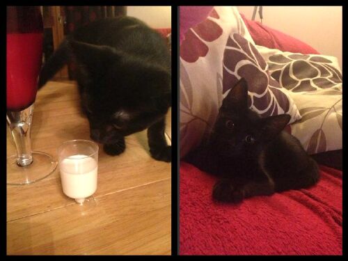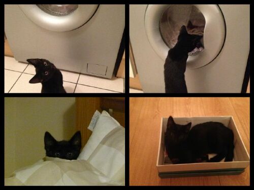 Przywlaszczyla sobie kosz na pranie ktory byl wlasnoscia C. – czarny z siatkowego materialu ktory jest obciagniety na sprezynie, wiec mimo ze jest wysoki na jakies 50 cm to ugina sie kiedy Kitty go pociagnie lapa, od tego juz tylko krok by tam wskoczyc i sie schowac. Kiedys przewracala go i turlala sie po living roomie jak chomik na kolku, teraz gromadzi tam wszelkie swoje zabawki oraz to co nam zdola podwedzic.