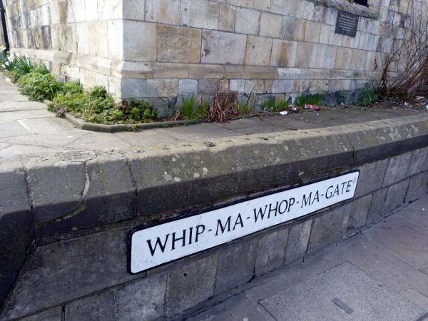 Skrecamy w lewo i przez najkrotsza ulice z najdluzsza nazwa: Whip-ma-whop-ma-gate idziemy do Collergate, gdzie na jednym ze sklepow widnieje plaskorzezba kota nr 2. Kot nr 3 miesci sie nieopodal, a wskazowka do jego odszukania jest: tik tak, tik tak….Whip-ma-whop-ma-gate byla niegdys miejscem gdzie wystawiano w dybach roznorakich kryminalistow by lud mogl ich publicznie potepic i ewentualnie obrzucic jajkami.