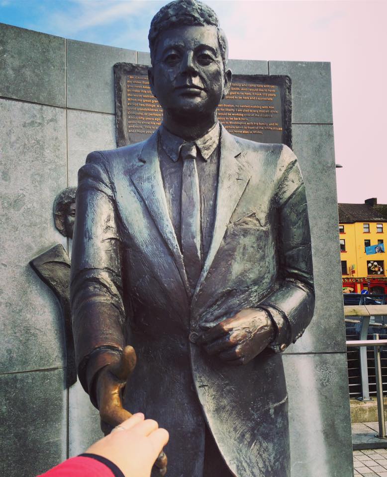 Ruszylysmy – tym razem z Irolka – na poludnie, w kierunku hrabstwa Wexford. Zatrzymalysmy sie najpierw w New Ross, miescie znanym glownie z tego ze stamtad wywodza sie przodkowie Johna F. Kennedy’ego. Slynny prezydent goscil tam w 1963 roku. Teraz jego STATUJA naturalnej wielkosci stoi w tym samym miejscu gdzie wyglaszal mowe do mieszkancow i mozna uscisnac jej prawice. No, lepsza statuja niz nazwanie kompleksu handlowego ze stacja benzynowa i hotelem Barak Obama Plaza, jak sie to stalo w Moneygall skad pochodza przodkowie tegoz. W New Ross znajduje sie tez replika statku Dunbrody, tzw famine ship, ktorym do Ameryki emigrowali Irlandczycy w czasie wielkiego glodu spowodowanego zaraza ziemniaczana. Poza tymi dwiema atrakcjami raczej nie ma juz nic ciekawego do ogladania.