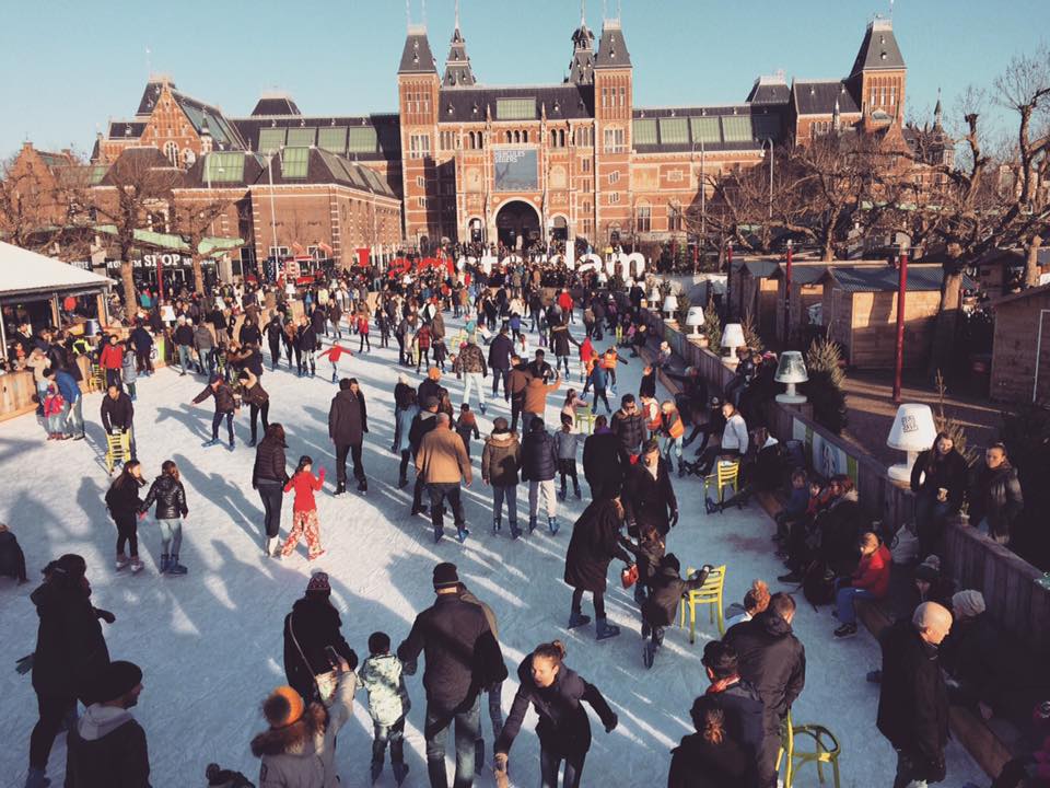 Zima przed Rijksmuseum jest sztuczne lodowisko. W Holandii bardzo rzadko pada snieg i zimy sa lagodne.