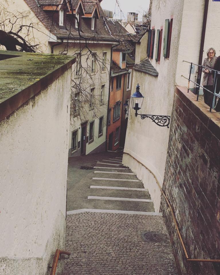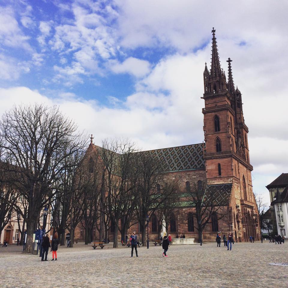 Stamtad juz o krok do rzeki i niezbyt imponujacych mostow, choc starowka z drugiej strony brzegu wyglada ladnie, zwlaszcza w promieniach slonca. Przysiadlysmy na lunch we wloskiej knajpce Zum Schmale Wurf (tak, bardzo wlosko brzmi 😉 gdzie zjadlam najlepsza nas swiecie zupe pomidorowa – niebo w gebie. A do tego karmilam z reki wrobelki. A potem juz bylo tylko lepiej bo odkrylysmy ze teren wokol katedry jest naprawde ladny, przypominal mi otoczenie zamku w Budapeszcie. Katedra miesci w sobie grob Erazma z Rotterdamu, a za 5 frankow mozna sie wspiac na gore co goraco polecam. Podczas wspinaczki na szczyt bardzo waskimi schodkami jest kilka platform widokowych wiec nie trzeba dojsc az na sama gore (ale warto).