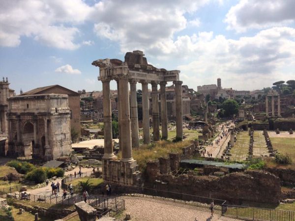 Nieopodal znajduje się Forum Romanum, najstarszy plac miejski w Rzymie. A właściwie to co z niego zostało czyli resztki. Ten wspaniały niegdyś plac, otoczony siedmioma wzgórzami, zapełniały swiątynie, łuki triumfalne, bazyliki i inne ważne budynki, np siedziba sądu i senatu. Forum zostało zdewastowane podczas najazdu Wizygotów w 410 roku, choć lud rzymski wykorzystywał go wciąż do zgromadzeń aż do roku 768 (obwołano tam wtedy papieżem Stefana III). Kolejnym ciosem dla Forum było trzęsienie ziemi, a w średniowieczu traktowanie go jako miejsca do pozysykiwania budulca. Ostały sie jedynie budynki zaadoptowane przez chrześcijan na kościoły. Prace wykopaliskowe zaczęto w 1803 roku i od tej pory prowadzone są systematycznie, choć całkiem niedawno dokonano kolejnego wandalizmu na Forum Romanum, a mianowicie Mussolini postanowił wybudować szeroką ulicę z Piazza Venezzia, gdzie urzędował, do Koloseum. Droga przechodzi przez część Forum i dzieli go na pół.