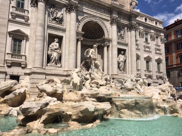 To wybitny przykład architektury baroku i istotnie robi wrażenie. Fontanna jest „przytulona” do fasady budynku, ma 20 m szerokości i 26 wysokości. Centralne postaci symbolizują 2 stany morza – spokojny i wzburzony. Cztery rzeźby na balustradzie to alegorie czterech pór roku, a postaci kobiece uosabiają Zdrowie i Obfitość. Turyści zwyczajowo wrzucają tam monety. Wyczytałam ze slużby porządkowe dziennie wydobywają z niej około 3000 euro (o innych walutach nie wspomniano).