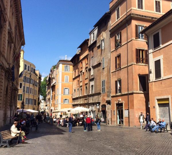 Jesteśmy w obrębie Centro Storico. Interesującym miejscem jest Campo di Fiori, plac targowy z nieciekawą przeszłością. Tam w średniowieczu odbywały się egzekucje skazańców. Jednym z nich był dominikanin Giordano Bruno, spalony na stosie za herezję. Na środku placu stoi teraz jego pomnik, zwrócony twarzą do Watykanu. Ma to symbolizować sprzeciw przeciwko państwu kościelnemu. Pomnik jest bardzo niepokojący, powiedziałabym złowróżbny. Wygląda posępnie nawet w pełnym słońcu.