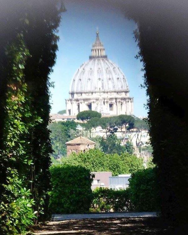 Powód drugi to najsłynniejszy widok na Watykan, można go bowiem zobaczyć przez dziurkę od klucza. Drzwi z dziurką prowadzą do zamkniętego pałacu kawalerów maltańskich. Choć Watykan jest oddalony o jakieś 4.5 km, wygladą tak jakby znajdował sie zaraz za wrotami, na końcu alei otoczonej szpalerem drzew. Kolejka do dziurki jest umiarkowana i posuwa się szybko. Nie próbujcie robic zdjęcia telefonem, nie wyjdzie. Nawet kamerą jest ciężko. Oto mój rezultat: