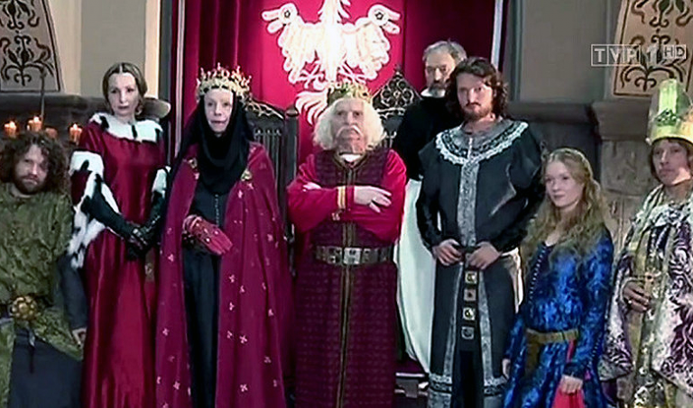Udało mi się przebrnąć przez prawie 3 odcinki. Czołówka nie jest zła choć kobieta strasznie wyje i raczej nie da się słuchać. Później mamy napisy na planszy które mają nas wprowadzić w temat. Napisy czytane głosem lektora. I już w pierwszej w zasadzie scenie pokazany jest kunszt scenariusza, bowiem do zamku króla Łokietka przybywa rycerz którego się pytają: kim jestes? jestem Pełka, uciekłem z niewoli u Litwinów. Chcę się widzieć z królem. Więc sługa wchodzi do sali tronowej i mówi że jakowyś Pełka chce się widzieć z królem. – Pełka? mówi ktoś – przecież on jest w niewoli u Litwinów. Po tej wymianie zdań spradziłam czy aby oglądam właściwy serial a nie jego parodię. Takich kwiatków jest więcej a właściwie cały serial oparty jest na dialogach i frazesach z d.py wziętych. Np: syn Łokietka, Kazimierz, mówi do swej żony podczas uczty: Daj mi syna. Ona na to: musisz przyjść do mojej sypialni. Nie było cię dwa lata. (A to się Kazik pewnie zdziwił bo zapytał tak jakby się spodziewał że żona wyciągnie niemowlaka z kieszeni: tadam!) W internecie można znaleźć najlepsze rozmowy z kolejnych odcinkow do których ja nie jestem w stanie dobrnąć, np: – Gdzie twoja żona? – pyta Jadwiga (żona Łokietka) swego syna Tadeusza. – Jest post. Nie sypiamy razem, więc nie wiem gdzie jest.
