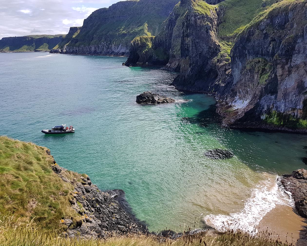 Kolejną atrakcją którą chciałam pokazać Dicie był wiszący most Carrick a Rede. Rozbawiła nas informacja że aby do niego dojść wymagany jest „high level of fitness„. Dojście zabiera może 15 minut i nie jest to trudny spacer, może jest to przekaz dla Amerykanów. Z powodu dużej ilości chętnych na trasę wpuszcza się pewną ilość zwiedzających co 45 min. Warto więc sprawdzić zanim się podjedzie żeby długo nie czekać. My akurat czekałyśmy siedząc blisko polskiej rodziny. Tatuś z ogoloną głową i wałkiem tłuszczu na karku kurwował co kilka minut, stosując to słowo jako przerywnik nie przejmując się że dzieci słuchają.