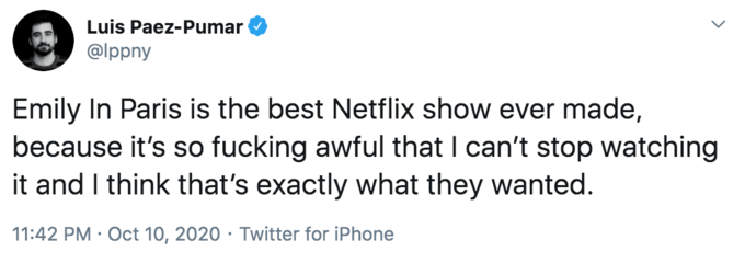 Pierwszy sezon EiP spotkał się z dużą krytyką, głównie ze strony Francuzów. Zupełnie tego nie rozumiem, bo Francuzi w serialu są pokazani z bardzo dobrej strony. Znają obce języki, są eleganccy, zachowują work-life balance i mają naprawdę dużo klasy i opanowania, by nie wyrzucić wkurwiającej Emilki przez okno. Emily była irytującą, szeroko uśmiechniętą ignorantką, przekonaną, że cały świat musi się kręcić wokół niej i że zjadła wszelkie rozumy. Jej maniera wrzucania TRES do każdego wypowiedzianego po angielsku zdania, co miało niby znaczyć, że stara się mówić po francusku, nawet Matkę Teresę wyprowadziłoby z równowagi. Wyobraźcie sobie, że do np Londynu, do brytyjskiej firmy, przyjeżdza pracownik czy menadżer, mówiący wyłacznie po francusku, oczekujący że każdy musi ten język znać i nim się posługiwać… Tymczasem wszyscy pracownicy Savoir, gdzie zaczyna panoszyć się Emily, tylko z powodu tej amerykańskiej księżniczki zaczynają posługiwać się angielskim, mało tego, klienci też!