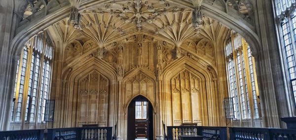 Natomiast wszyscy miłośnicy książek (ale i architektury) powinni pójść do drugiej najstarszej brytyjskiej biblioteki, Bodleian Library, ufundowanej przez Thomasa Bodleya w 1602 roku. Nie ma innej opcji, jak wykupienie biletu na wycieczkę z przewodnikiem. Ponieważ jest kilka różnych opcji, zdecydowanie polecam całościową, ze zwiedzaniem wszystkich dostępnych budynków. Niestety, Radcliffe Camera, czyli charakterystyczny okrągły budynek jaki widać w moim poprzednim poście, był zamknięty dla turystów.