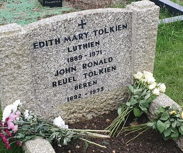 Inskrypcja również jest skromna, to tylko imiona i nazwisko żony pisarza i jego samego, z datami śmierci. Są tam też imiona Beren i Luthien, literackiej pary z twórczości Tolkiena. Luthien z rodu elfów zakochała się w śmiertelnym Berenie, poświęcając dla niego swoją nieśmiertelność. Autor bardzo kochał swoją żonę, która często go inspirowała. Tak bardzo, że zrezygnował w końcu ze swojej drugiej miłości – Oxfordu.