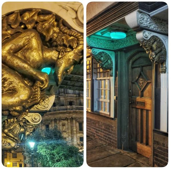 Ponoć C S Lewis, wracając wieczorem z pubu, postanowił iść na skróty niewielką uliczką St Mary’s Passage. Tam ujrzał świecącą we mgle latarenkę, a kiedy spojrzał w bok, zobaczył fantazyjną płaskorzeźbię lwiej głowy. Wtedy to powstała w jego głowie historia o Narnii, do której prowadzi latarnia, gdzie włada lew Aslan. Same drzwi to tajemnicze wejście przez szafę, a sylwetki faunów to również postaci z książki.