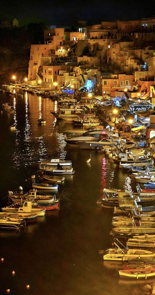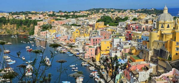 W kolejnym poście będę pisać o samej wyspie, ale najpierw tradycyjnie wstęp. Na Procidę można się dostać z Neapolu promem, albo też promem z okolicznych miast i wysp, choćby z Sorrento i Ischii. Z lotniska w Neapolu kursuje Alibus, robiący loop pomiędzy terminalem, dworcem kolejowym i dwoma przystankami w porcie (5€). Z powrotem wzieliśmy prom do Pozzuoli, bo był wcześniej, a potem metro do Napoli Centrale. Prom przypływa do Marina Grande, nie jest to ta część wyspy, która jest najbardziej malownicza i która figuruje na wszystkich pocztówkach, czyli Marina di Corricella, gdzie był nasz wynajęty apartment. Można tam dojść z portu w 10-15 minut, ale przeurocza właścicielka mieszkania zaproponowała, że zamówi nam taksówkę wodną. To był świetny pomysł, bo kierowca łodzi zabrał nas do bardzo malowniczej groty, a kiedy wreszcie zza skał wynurzyła się w całej krasie kolorowa zabudowa Procidy, aż nam dech zaparło, zakrzyknął z dumą: Ecco qui Coricella!