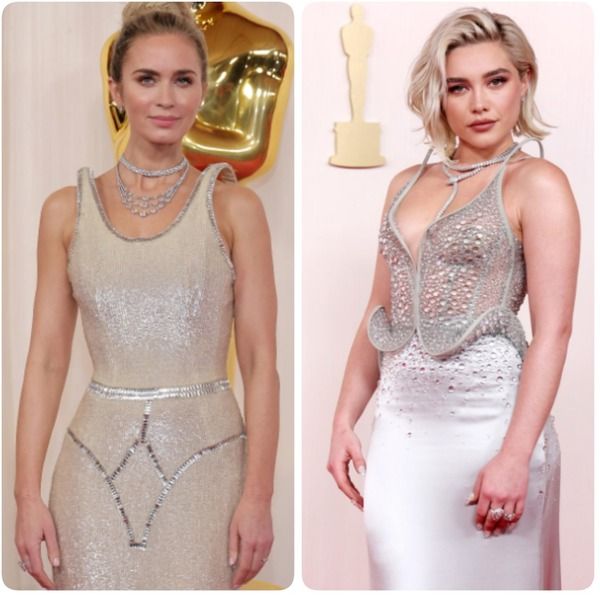 Pora na fruwające ramiączka. I jak sukienka Florence Pugh nawet jest ok mimo tego dziwnego detalu, to Emily Blunt ma coś w stylu zarysu majtek na materiale, choć mnie się kojarzy z tarczą strzelniczą i „celuj tu”.