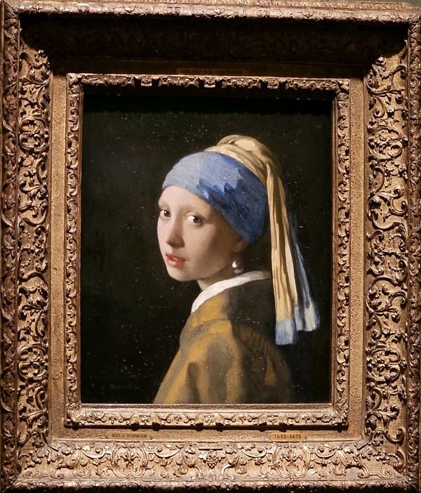 Oczywiście największym magnesem przyciągającym ludzi jest Vermeer: A girl with a pearl earring oraz The view of Delft. Dziewczyna z perłą nie jest portretem prawdziwej osoby, to tzw tronie czyli artystyczna wprawka. Trudno uwierzyć, ale te wilgotne usta i piękne oczy to wyobraźnia artysty. A kolczyk nie ma uchwytu: artysta maźnął go najprawdopodobniej na samym końcu, bo brakowało mu trzeciego po wardze i oku punktu przyciągającego spojrzenie. Zwróćcie uwagę na nos – zazwyczaj jego kontur jest namalowany, a na tym obrazie nie ma nawet różnicy w kolorze między nosem a policzkiem po lewej stronie. Nasze oko widzi kształt nosa dzięki półcieniowi po prawej.
