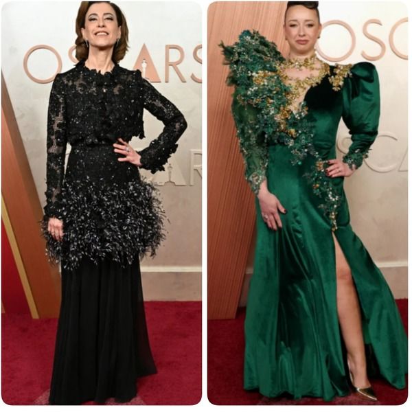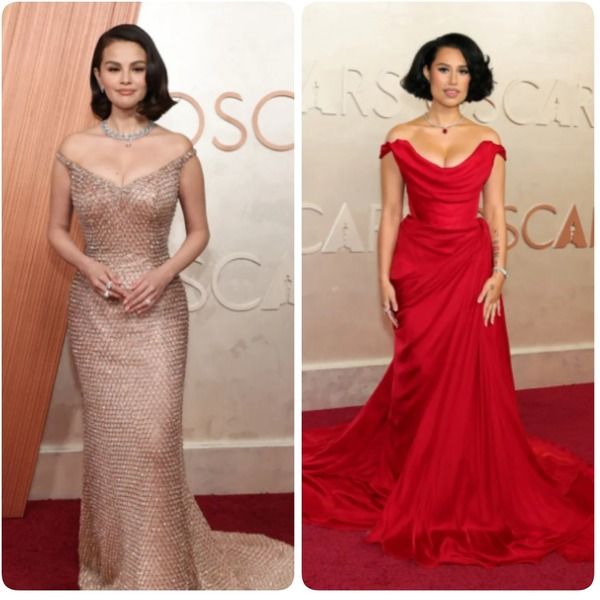 Kolejne dwie panie to Selena Gomez i Raye w bardzo różnych sukniach – Selena w czymś, co z daleka wygląda jak pastelowa kolczuga, a Raye w ognistej czerwieni. Rozpoznałam Vivienne Westwood 🙂